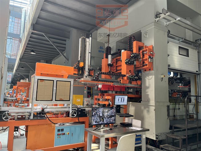 工作原理:落料沖床沖壓開料,料片通過磁性輸送帶進行傳輸?shù)教囟ㄎ恢糜扇×蠙C械手進行取料,取料機械手上升至送料線高度,由三次元機械手進行夾取送料以及移送,進行多個工序沖壓。